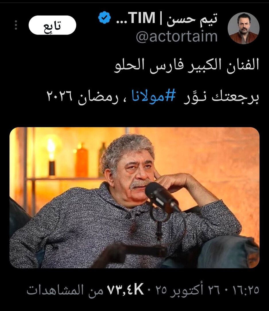 ونشر حسن عبر منصة "إكس" صورة لفارس الحلو، مُرفقا تعليقا كتب فيه: "الفنان الكبير فارس الحلو.. برجعتك نور مولانا، رمضان 2026".