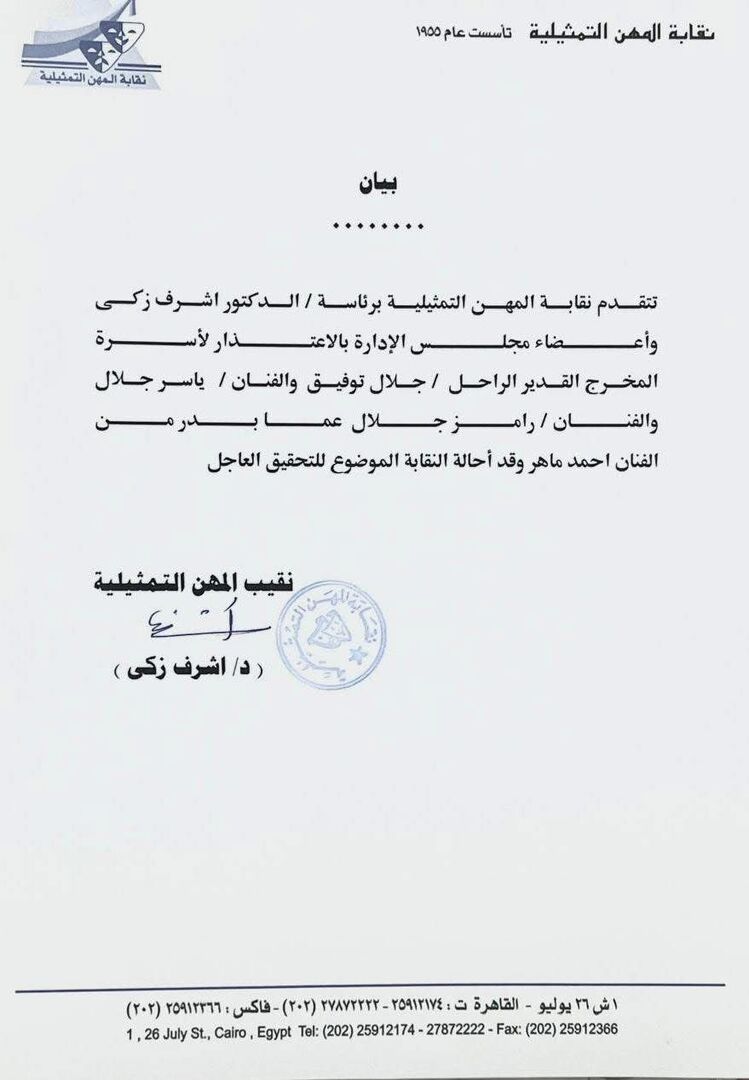 وتقدمت النقابة في بيان رسمي بالاعتذار لأسرة المخرج الراحل جلال توفيق، مؤكدة إحالة الموضوع إلى التحقيق بشكل فوري.