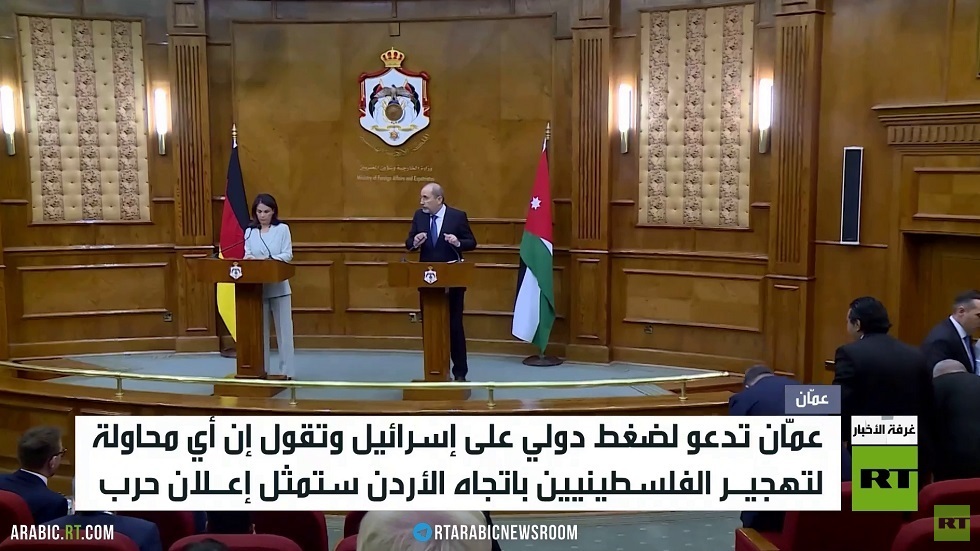قال وزير الخارجية الأردني أيمن الصفدي في مؤتمر صحفي مع نظيرته الألمانية أنالينا بيربوك، إن أي محاولة لتهجير الفلسطينيين باتجاه الأردن ستكون بمثابة إعلان حرب..