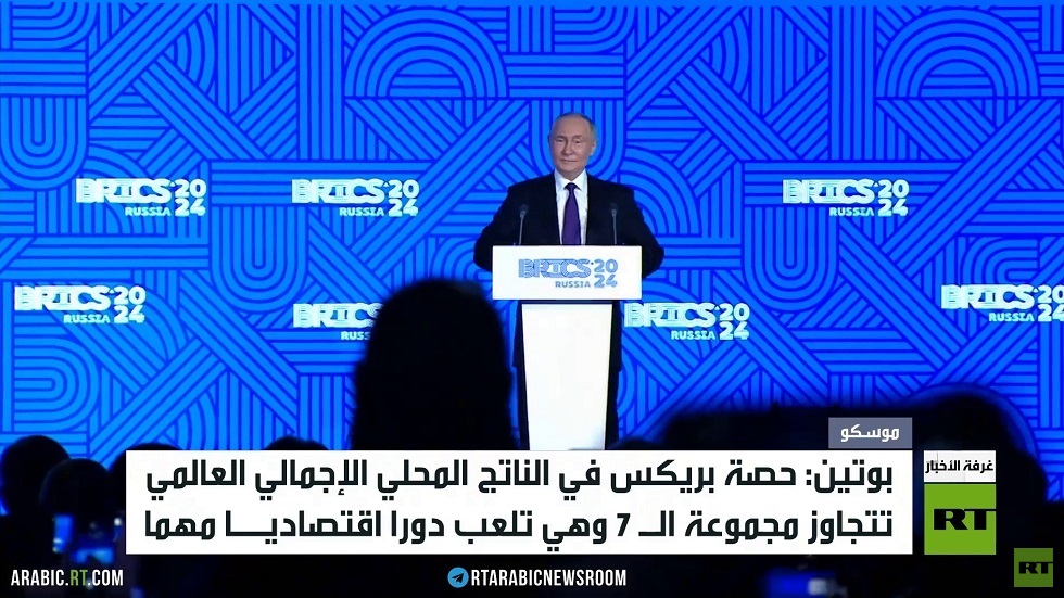 أكد الرئيس الروسي فلاديمير بوتين أن حصة بريكس في الناتج المحلي الإجمالي العالمي تتجاوز نظيرتها لمجموعة السبع..