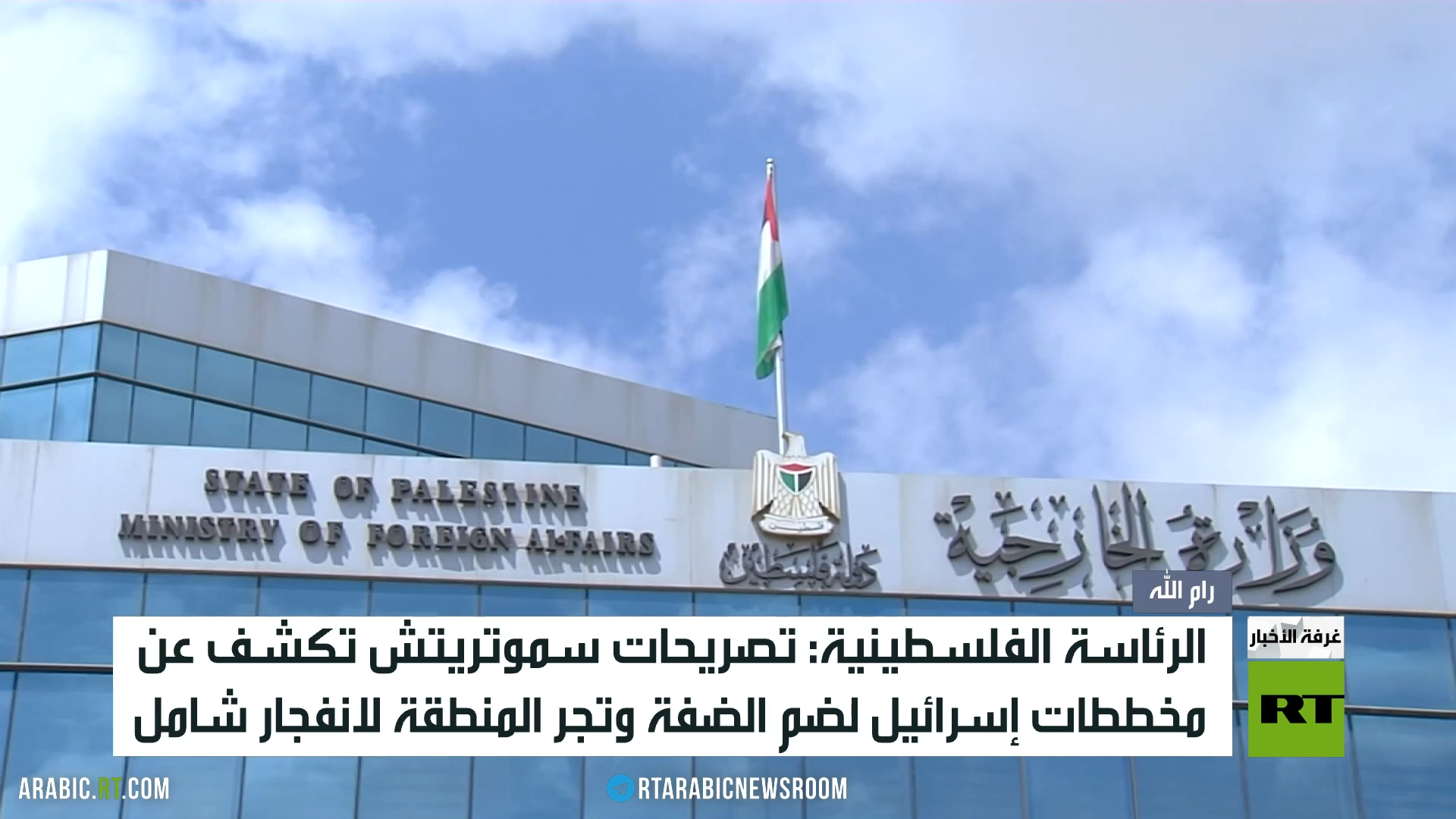 وقال الناطق الرسمي باسم الرئاسة الفلسطينية نبيل أبو ردينة إن تصريحات وزير المالية الإسرائيلي بتسلئيل سموتريتش تكشف محاولات الاحتلال تنفيذ مخططاته بضم الضفة الغربية ، واعتبر أن هذه المخططات تجر المنطقة نحو انفجار شامل.