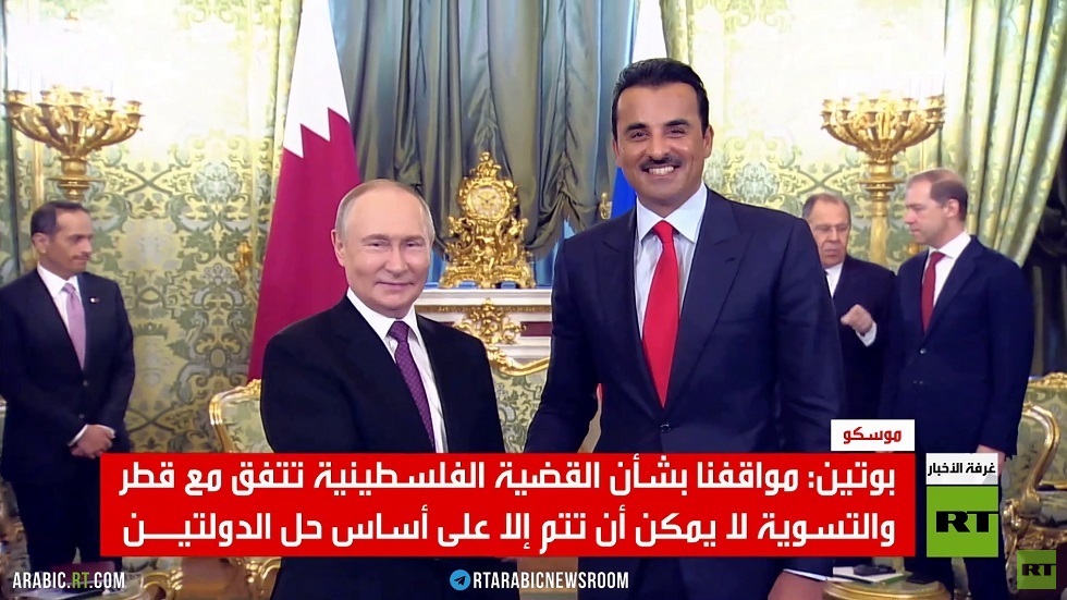 أكد الرئيس الروسي /فلاديمير بوتين/ خلال اجتماعه مع أمير قطر /تميم بن حمد آل ثاني/ في موسكو، أن حل الدولتين هو السبيل الوحيد لتسوية القضية الفلسطينية..
