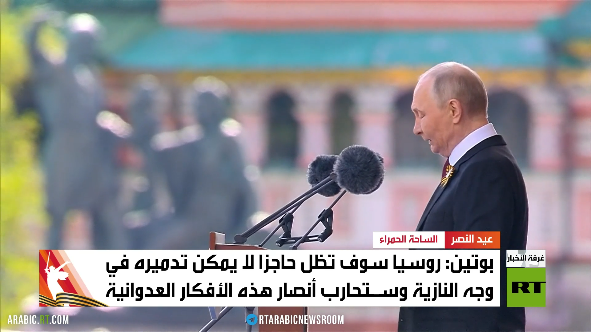 وأكد الرئيس فلاديمير بوتين، في كلمته خلال العرض العسكري بالساحة الحمراء، أن روسيا كانت وستبقى حاجزا لا يمكن تدميره أمام النازية، مشددا على أنها ستواجه كل محاولات تشويه تاريخ الحرب العالمية الثانية، وموضحا أن الشعب الروسي بالكامل يدعم المشاركين بالعملية العسكرية الخاصة، ويفخر بشجاعتهم وبطولاتهم.