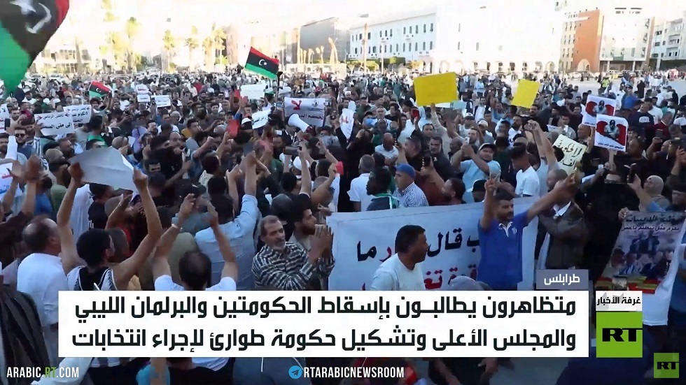 ورفع المتظاهرون شعارات تطالب بإسقاط جميع الأجسام السياسية القائمة في البلاد، بما في ذلك حكومتا طرابلس وبنغازي، ومجلس النواب، والمجلس الأعلى للدولة.