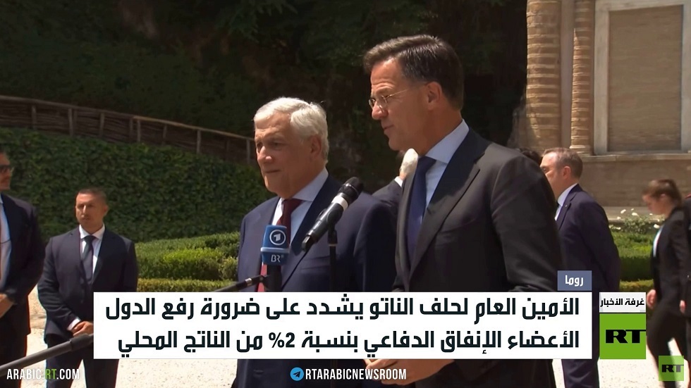 الأمين العام لحلف الناتو، مارك روته، أكد خلال اجتماع صيغة "فايمار بلس" في روما، ضرورة زيادة الإنفاق إلى أكثر من اثنين بالمئة من الناتج المحلي، في حين أبدى وزير الخارجية الإيطالي، أنتونيو تاجاني، تحفظاتٍ حول ربط أهداف الحلف بمسارات عسكرية.