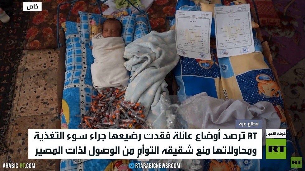 وتابع فريق آرتي في غزة مأساة عائلة فلسطينية عقب وفاة رضيعها أحمد، تاركا توأمه مازن وحيدا يعاني من شح الغذاء وفقدان الأمن.