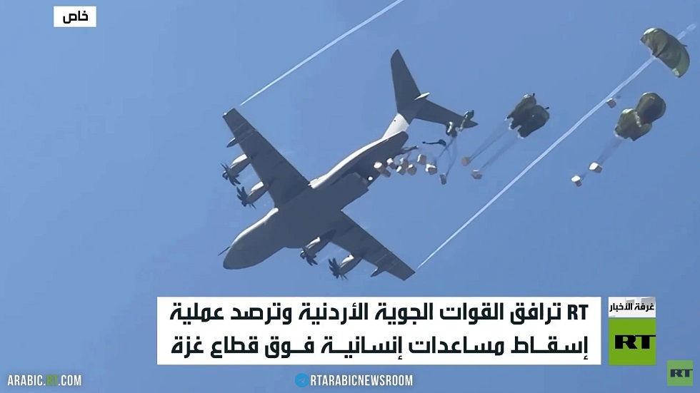 رافقت فريق ار تي القوات الجوية الأردنية في تنفيذ عمليات إنزال مساعدات غذائية وطبية فوق قطاع غزة، بمشاركة عدد من الدول العربية والأجنبية..