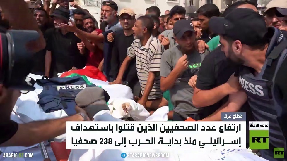 شيّع الفلسطينيون جثامين ستة صحفيين اغتالتهم إسرائيل ليلة أمس بقصف استهدف خيمتهم في محيط مستشفى الشفاء، ما رفع أعداد الضحايا من الصحفيين إلى مئتين وثمان وثلاثين ضحية منذ بداية الحرب