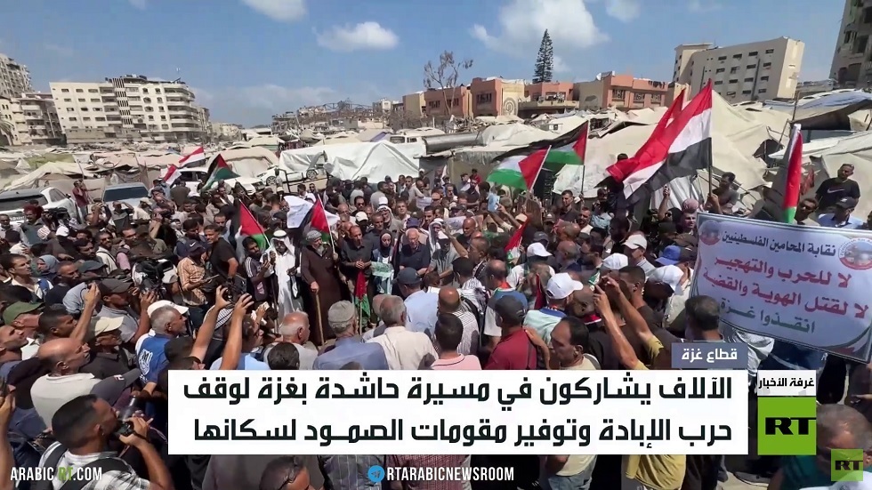 خرجت آلاف الفلسطينيين بقطاع غزة في مسيرة حاشدة، بدعوة من مؤسسات المجتمع المدني والنقابات والاتحادات والنخب الفلسطينية.