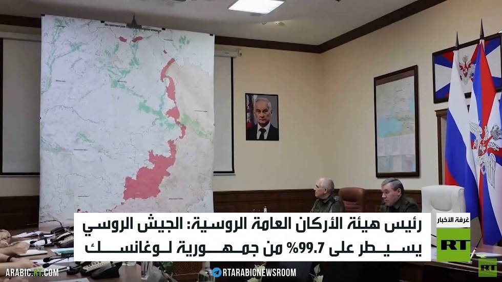 مشيرا إلى تحرير أكثر من تسعة وتسعين بالمئة من أراضي جمهورية لوغانسك، وتسعة وسبعين بالمئة من أراضي جمهورية دونيتسك..
