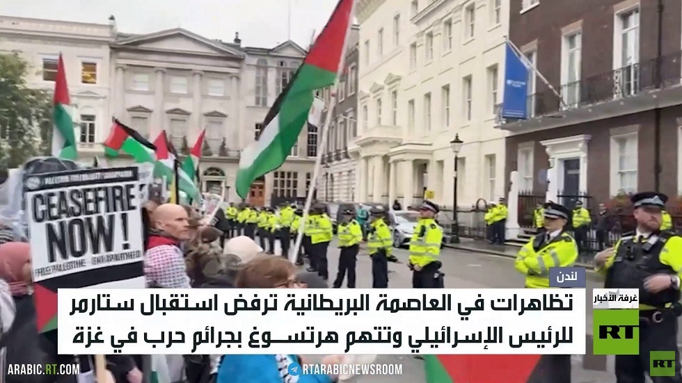 نظم التحالف من أجل فلسطين في بريطانيا وقفة احتجاجية في لندن تنديدا بزيارة الرئيس الإسرائيلي إسحاق هرتسوغ واستقباله من طرف رئيس الحكومة البريطانية كير ستارمر.