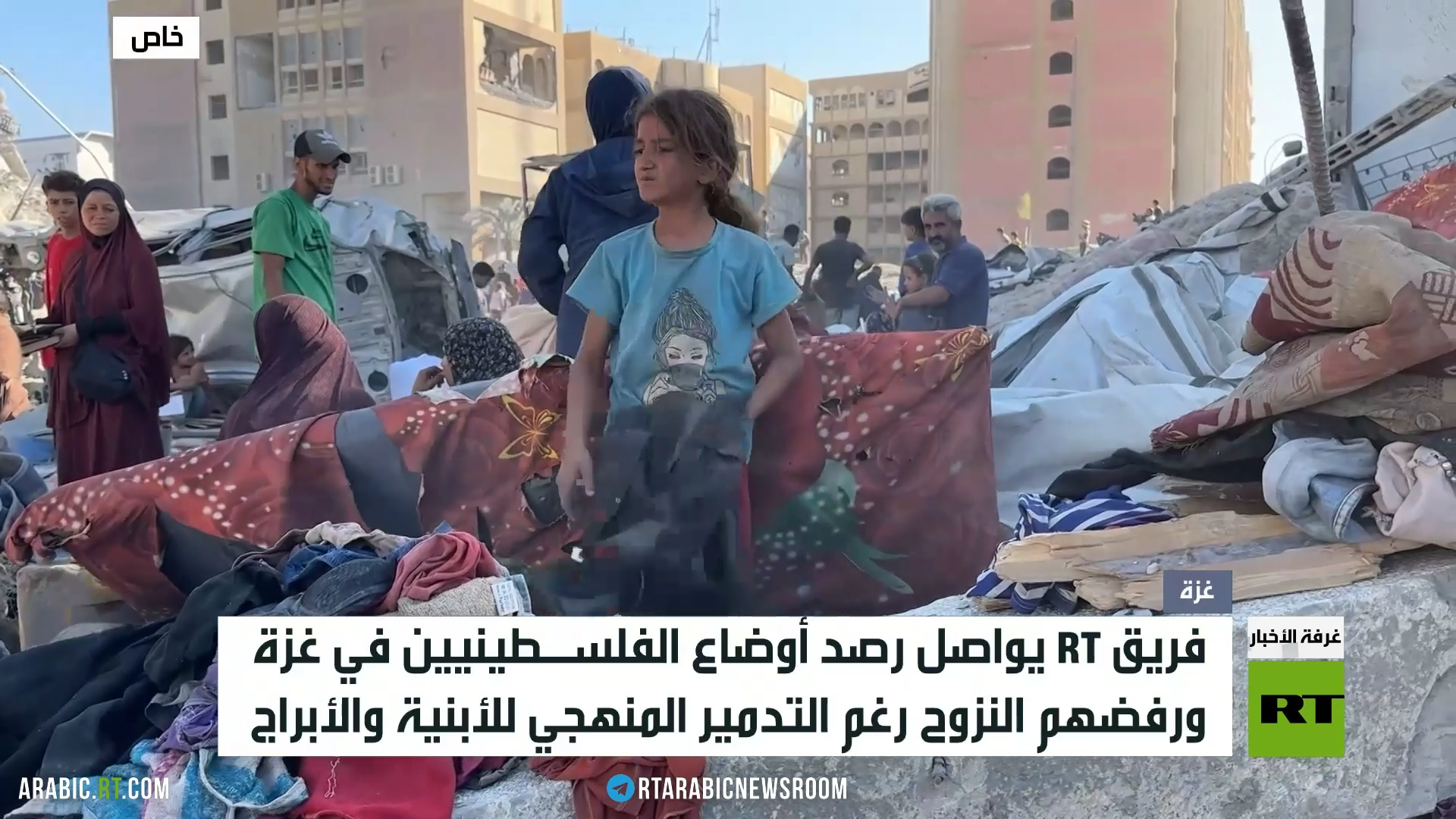 فريق آر تي تابع أوضاع العائلات المشردة جراء تفجير المباني والأبراج والخيام، ورفْض الفلسطينيين الخروج من المدينة رغم التدمير والترهيب الإسرائيلي.
