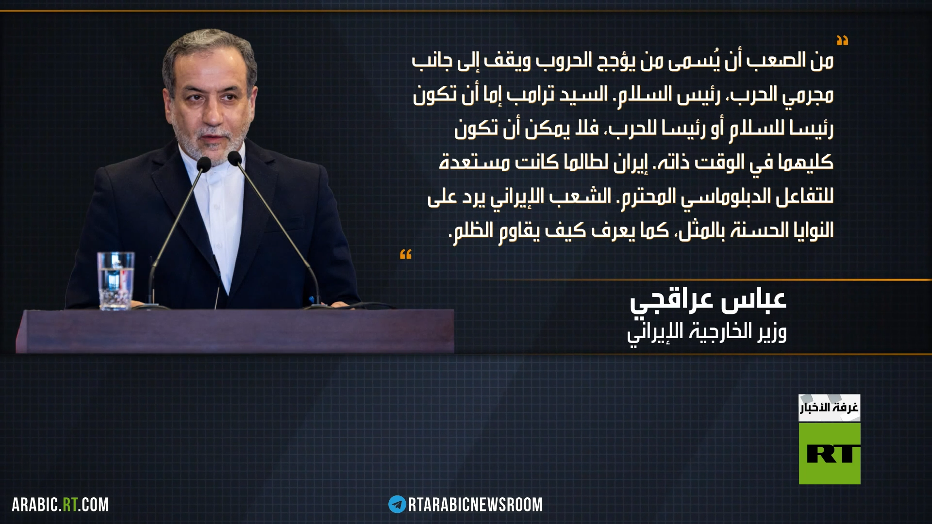 وأضاف عراقجي ردا على إعلان ترامب رغبته في تحقيق السلام مع إيران، أن الشعب الإيراني لا يصدق تصريحات رئيسٍ شارك في قصف المنازل والمناطق المدنية في إيران.