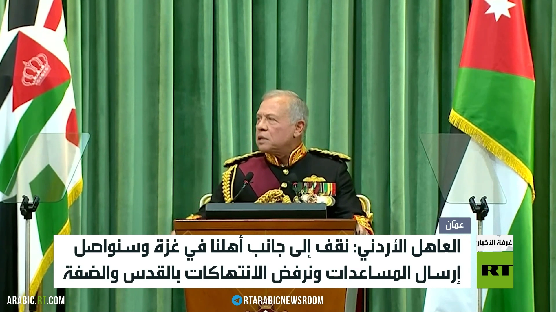أكد العاهل الأردني الملك عبد الله الثاني، خلال خطاب العرش أمام مجلس الأمة، التزام عَمان الثابت بالوقوف إلى جانب أهالي غزة، في ظل ما يمرون به من كارثة إنسانية.