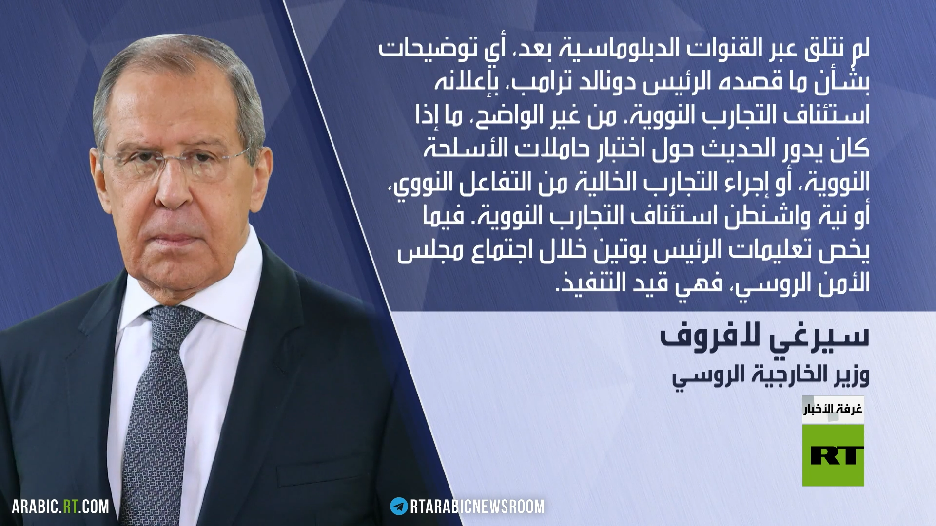 وأشار لافروف إلى أن موسكو لم تتلق أي توضيحات بشأن ما قصده الرئيس الأمريكي دونالد ترامب باستئنافِ التجاربِ النووية