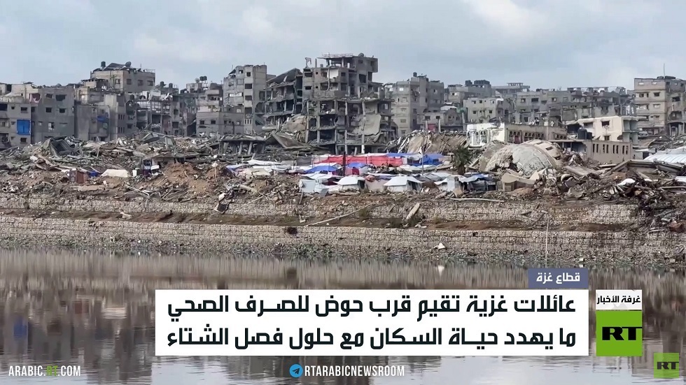 يتصاعد مع بداية موسم الأمطار الخطر في حي الشيخ رضوان بغزة، حيث تقيم عائلات نازحة بخيام مهترئة بمحاذاة حوض للصرف الصحي..