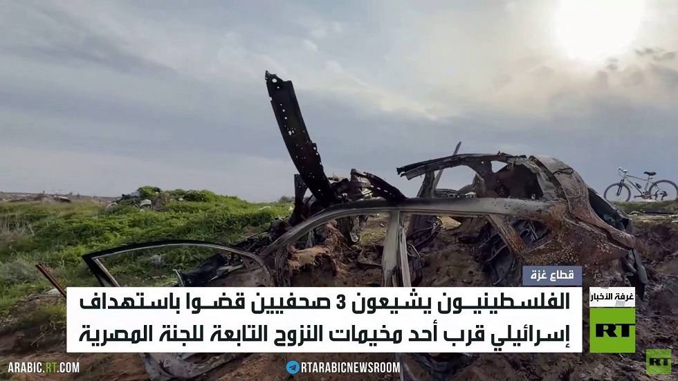 شيع المواطنون في قطاع غزة ثلاثة صحفيين استهدفتهم القوات الإسرائيلية بلقرب من أحد مخيمات النزوح التابعة للجنة المصرية..