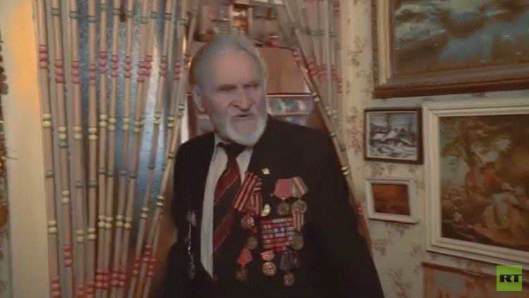 وتخبر نياشينه البراقة بأنه مقاتل من ذاك الزمان.. ألكسندر توربين روسي تسعيني، مظلي- قناص برتبة عقيد، حارب ضمن فيلق الإنزال 38، أحد طلائع القوات السوفيتية التي حررت فيينا من النازيين في 13 أبريل/نيسان عام 1945.