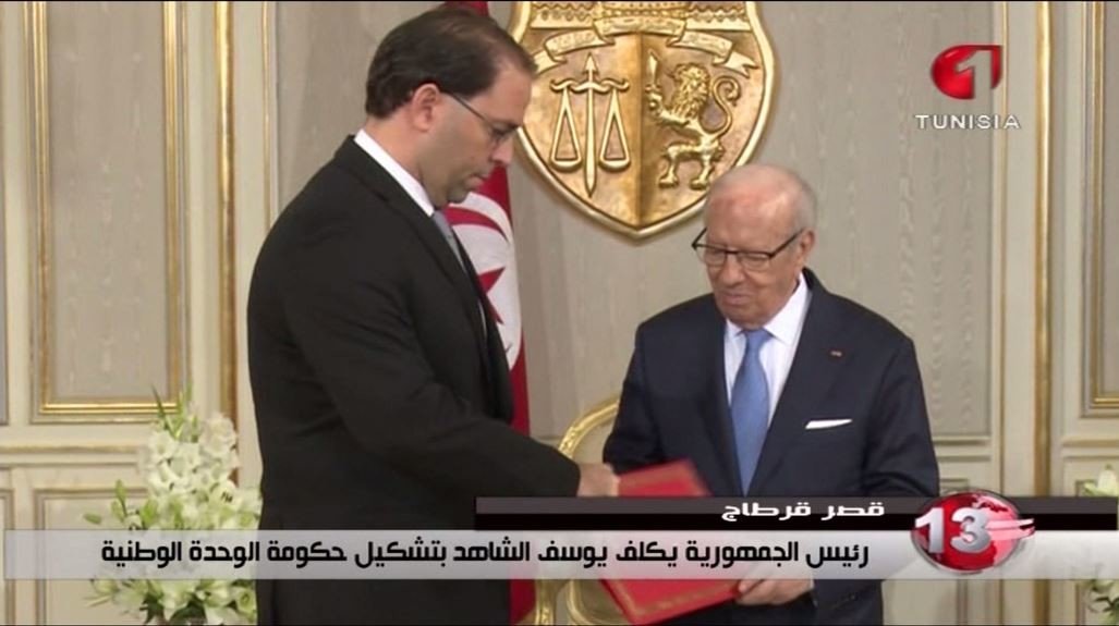 كلف الرئيس التونسي الباجي قائد السبسي وزير الشؤون المحلية يوسف الشاهد بتشكيل حكومة وحدة وطنية، وتعهد الشاهد بأن تضم التشكيلة الوزارية الجديدة كفاءات وطنية بعيدا عن المحاصصة الحزبية