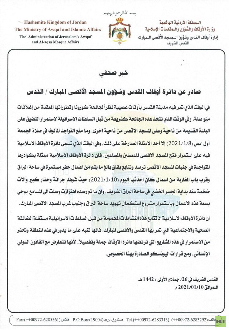 وحذر البيان من الاستمرار في هذه المشاريع التي رفضتها دائرة الأوقاف جملة وتفصيلا لأنها تتعارض مع القانون الدولي الإنساني ومع قرارات اليونيسكو الصادرة بهذا الخصوص.