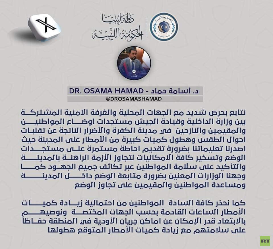 وقال في بيان نشره على منصة "X": "نتابع بحرص شديد مع الجهات المحلية والغرفة الأمنية المشتركة بين وزارة الداخلية وقيادة الجيش مستجدات أوضاع المواطنين والمقيمين والنازحين في مدينة الكفرة والأضرار الناتجة عن تقلبات أحوال الطقس وهطول كميات كبيرة من الأمطار على المدينة".