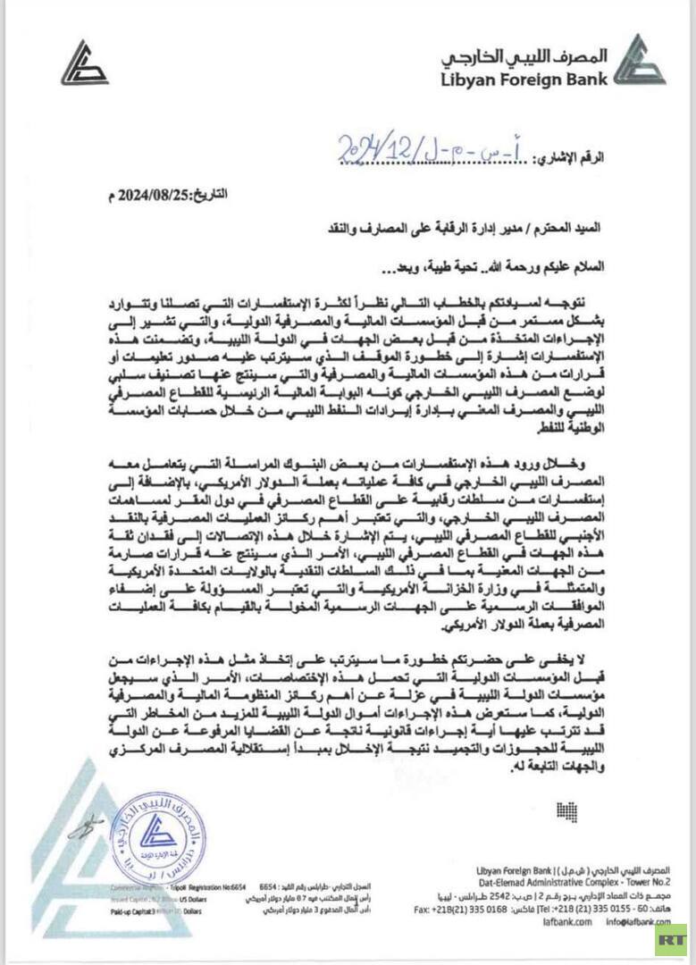 وأشار المصرف بأن ذلك قد ينتج عنه قرارات صارمة من السلطات النقدية الأمريكية وعزل المنظومة المصرفية الليبية مما سيجعل المصارف عاجزة عن استيفاء التزاماتها.