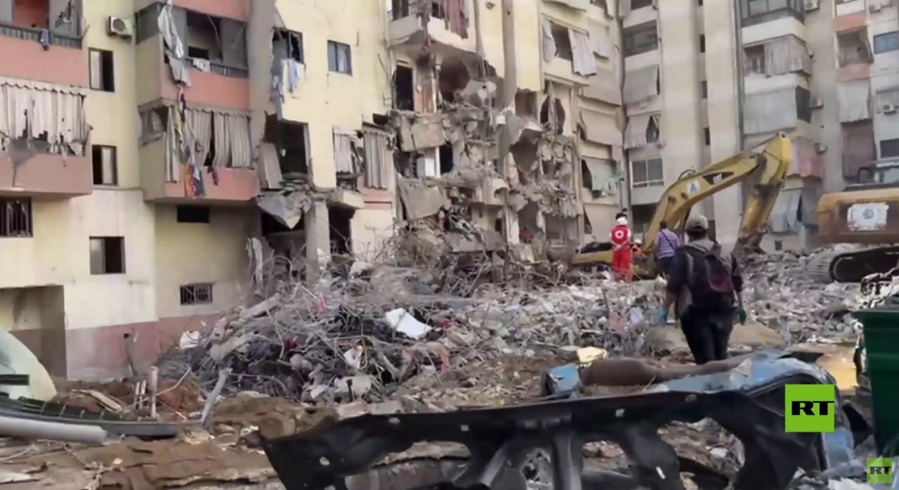 مشاهد توثق استمرار عملية رفع أنقاض المبنى المستهدف بغارة إسرائيلية في الضاحية الجنوبية لبيروت