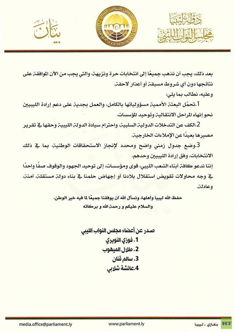 واختتم النواب بيانهم بدعوة الليبيين إلى توحيد الجهود لرفض أي محاولات لتدويل الأزمة أو فرض حلول خارجية لا تتوافق مع إرادة الشعب الليبي.