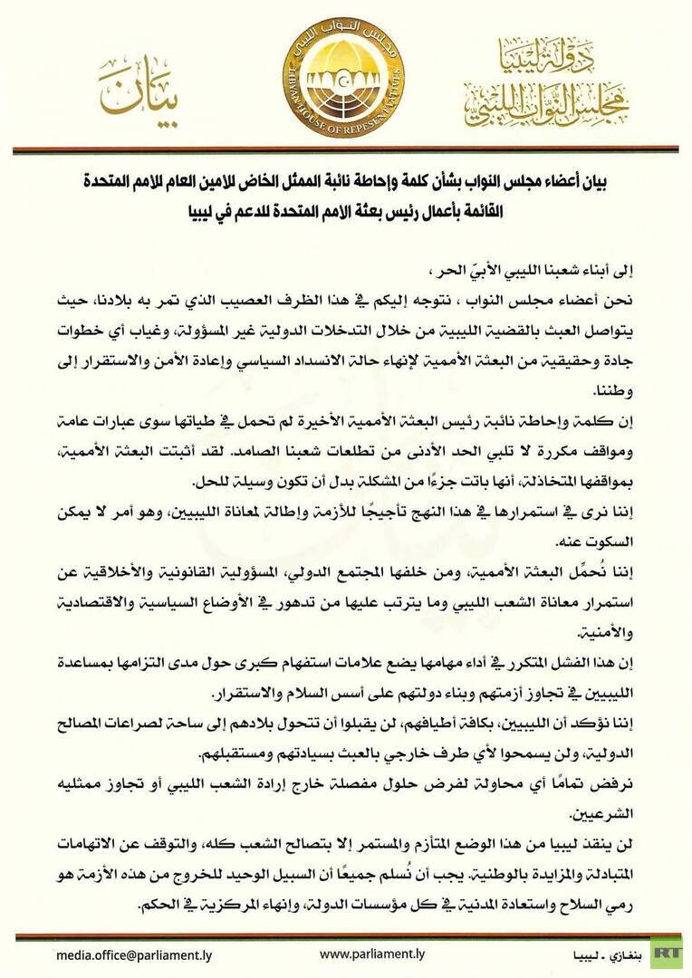 واتهم النواب البعثة الأممية بتجاهل مسؤولياتها القانونية والأخلاقية حيال الأوضاع المتدهورة في البلاد، داعيا إلى ضرورة احترام سيادة ليبيا والكف عن التدخلات الدولية السلبية.