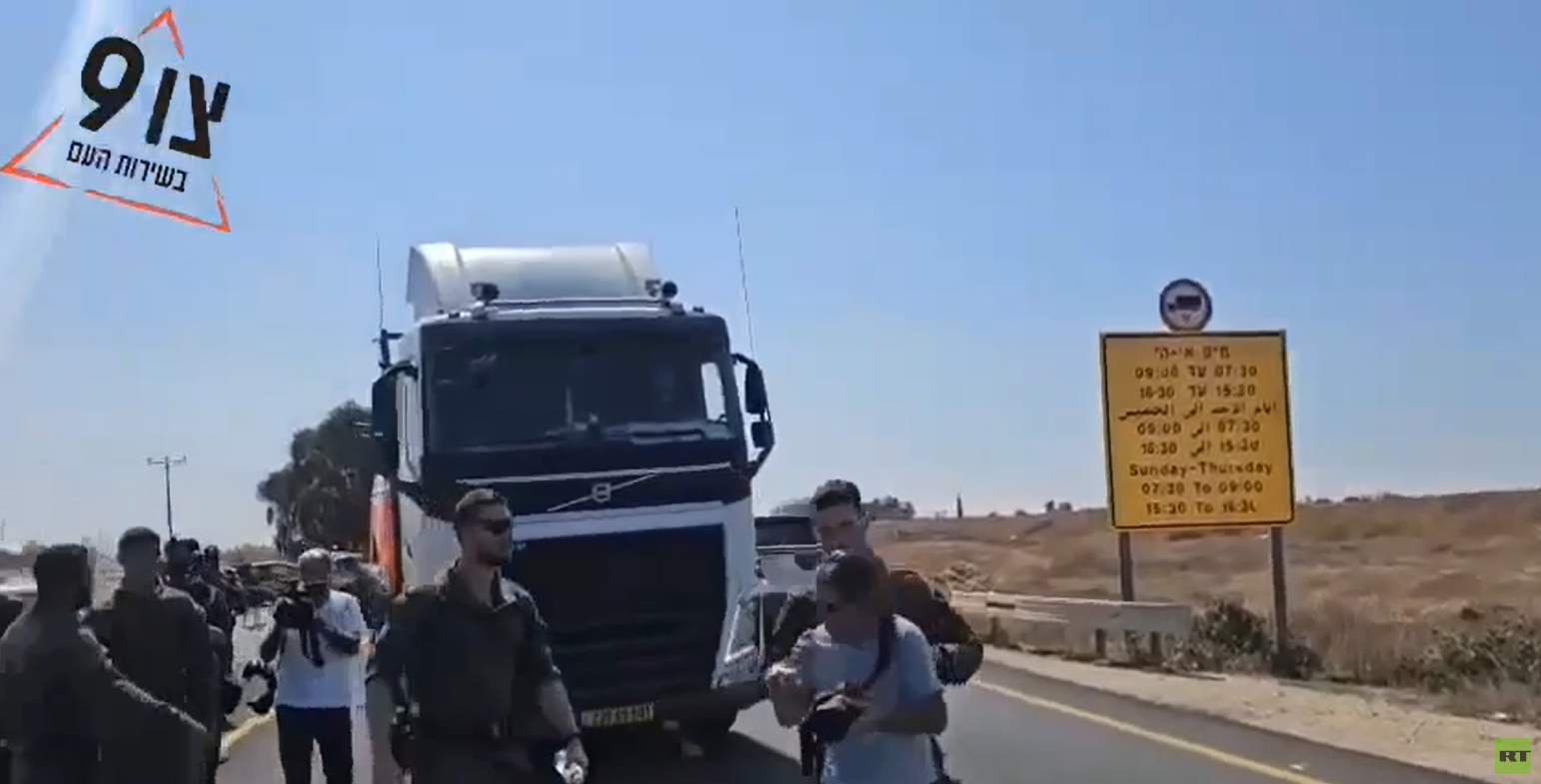 مستوطنون يعيقون دخول شاحنات المساعدات الإنسانية إلى غزة (فيديو)