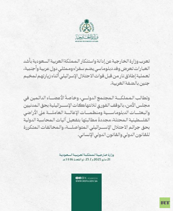 أدانت الخارجية السعودية واستنكرت بأشد العبارات تعرض وفد دبلوماسي يضم سفراء وممثلي دول عربية وأجنبية، لإطلاق نار من قبل القوات الإسرائيلية أثناء زيارتهم لمخيم جنين بالضفة الغربية.