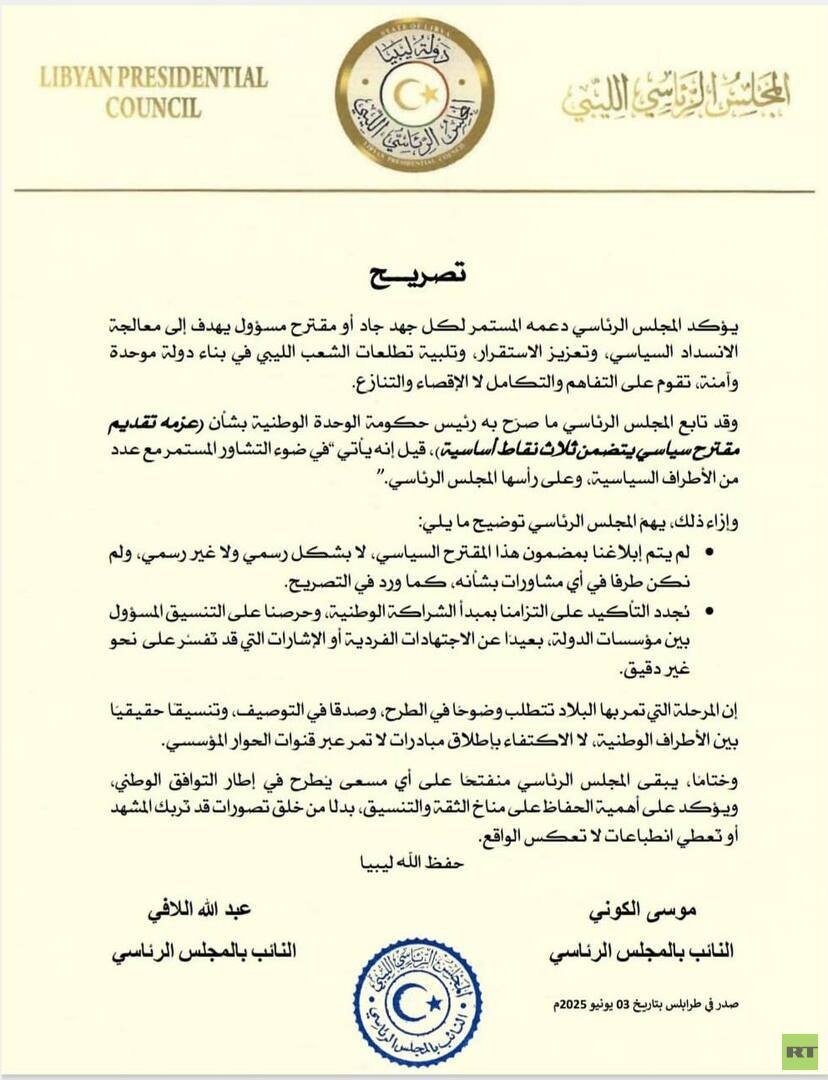 وأصدر عضوا المجلس الرئاسي الليبي موسى الكوني وعبد الله اللافي، بيانا، أكدا فيه أن المجلس يدعم أي جهد جاد أو مقترح مسؤول يهدف إلى معالجة الانسداد السياسي، وتعزيز الاستقرار، وتلبية تطلعات الشعب الليبي نحو دولة موحدة وآمنة تقوم على التفاهم والتكامل لا الإقصاء والتنازع.