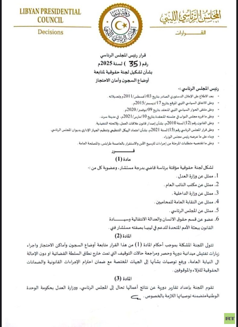 أصدر رئيس المجلس الرئاسي الليبي محمد المنفي قرارا بشأن تشكيل لجنة حقوقية مؤقتة لمتابعة أوضاع السجون وأماكن الاحتجاز وذلك في إطار تعزيز حقوق الإنسان وسيادة القانون في البلاد.
