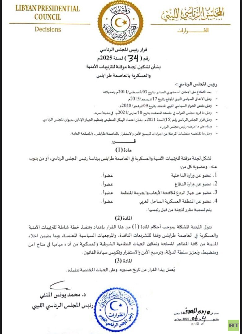 كما أصدر رئيس المجلس الرئاسي الليبي قرارا آخر يقضي بتشكيل لجنة مؤقتة تتولى مسؤولية الترتيبات الأمنية والعسكرية في العاصمة طرابلس.