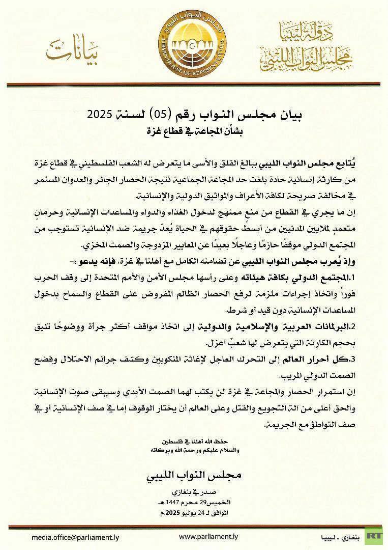 أعرب مجلس النواب الليبي عن بالغ القلق والأسى إزاء ما يتعرض له الشعب الفلسطيني في قطاع غزة من كارثة إنسانية غير مسبوقة.