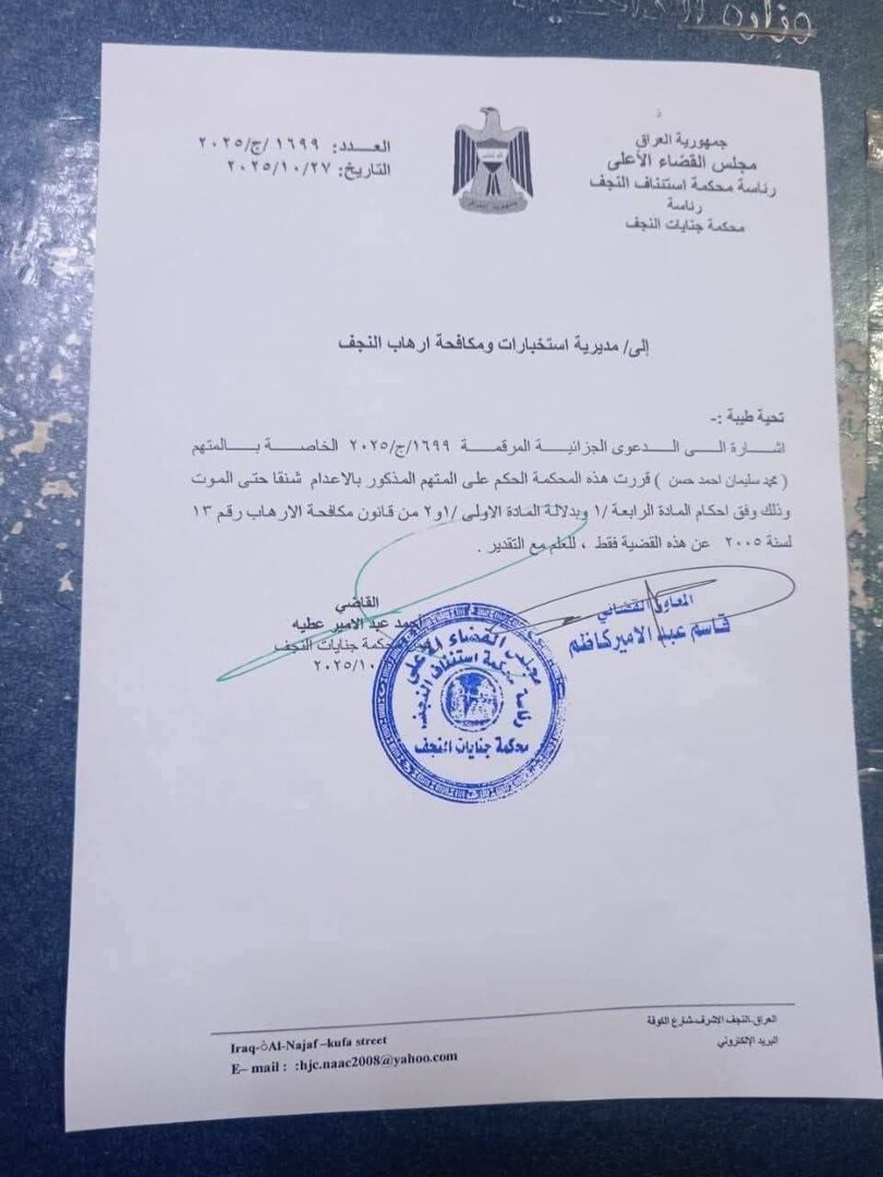 وشدّد مجلس القضاء الأعلى على أن الحكم غير نهائي، إذ سيُعرض تلقائيا على محكمة التمييز الاتحادية للتدقيق، وفقا للإجراءات القانونية المتبعة في القضايا التي تُصدر فيها أحكام بالإعدام.