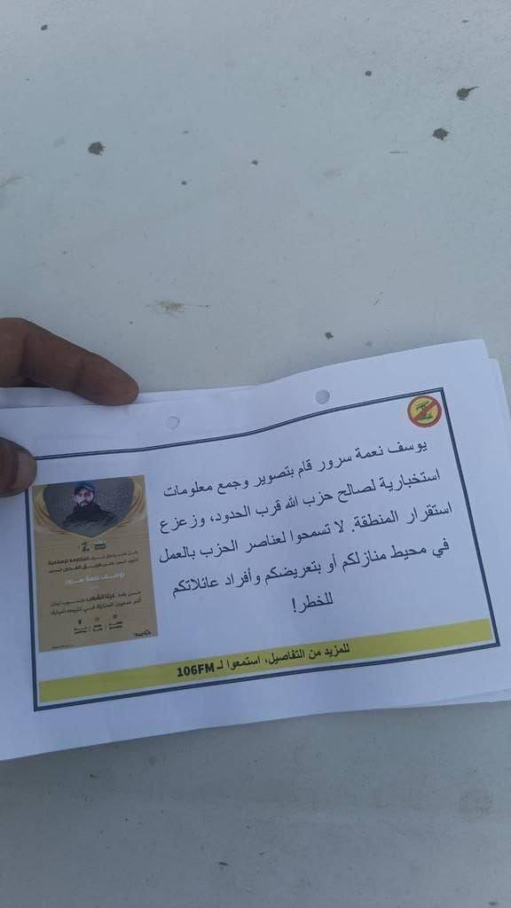 كما ألقى الجيش الإسرائيلي منشورات تحذيرية فوق بلدة عيتا الشعب في الجنوب اللبناني، زاعما أن أحد المواطنين قام بتصوير وجمع معلومات استخبارية لصالح حزب الله قرب الحدود.