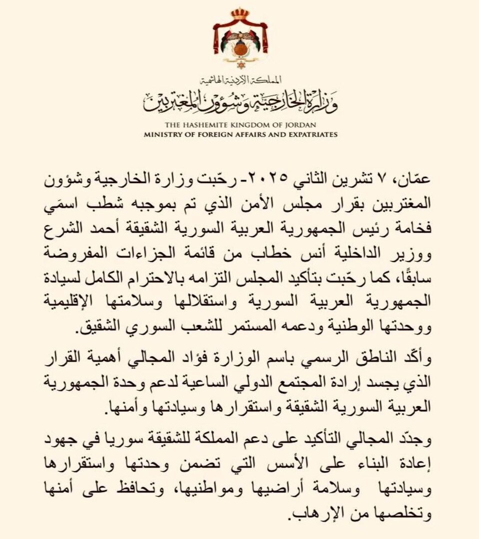 رحب الأردن بقرار مجلس الأمن الدولي بشطب اسم الرئيس السوري أحمد الشرع من العقوبات الأممية المفروضة سابقا، كما رحّب بتأكيد التزام المجلس أيضا باحترام سايدة سوريا ووحدتها الوطنية.