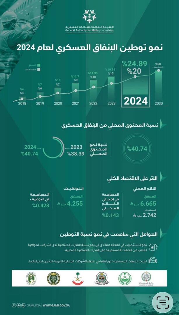 أعلنت الهيئة العامة للصناعات العسكرية عن ارتفاع نسبة توطين الإنفاق العسكري في المملكة إلى 24.89% بنهاية عام 2024، في تقدم نحو تحقيق المستهدف الذي يزيد عن 50% بحلول عام 2030.