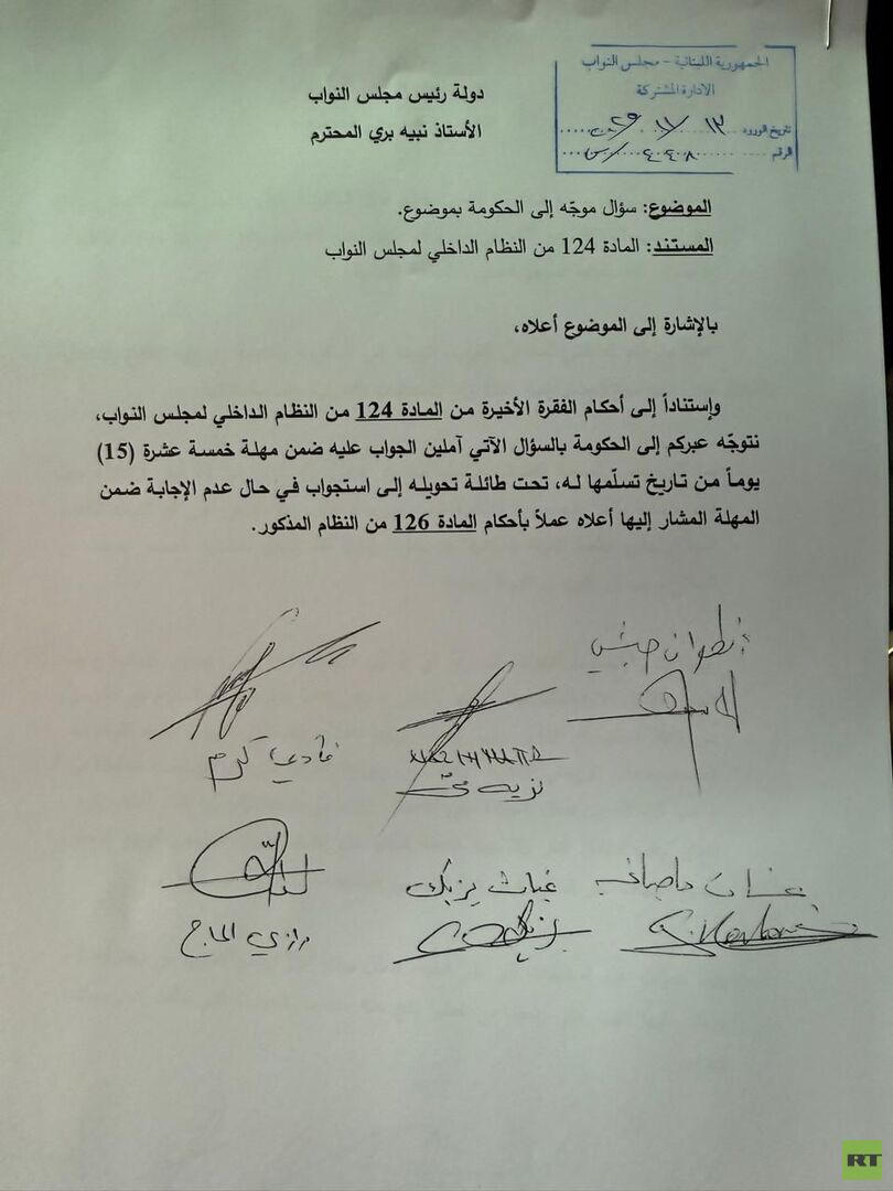 وأضاف الحزب أنه في حال عدم الإجابة ضمن المهلة عملا بأحكام المادة 126 من النظام المذكور، فإن السؤول سيتحول إلى استجواب.