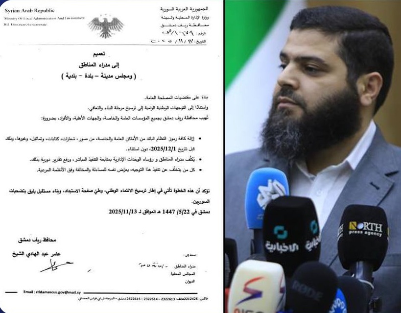 أصدر محافظ ريف دمشق عامر الشيخ تعميما شدد بموجبه على إزالة كل رموز النظام السابق في الأماكن العامة والخاصة من صور وشعارات وكتابات وكابلات وتماثيل وغيرها قبل 1 ديسمبر دون استثناء.