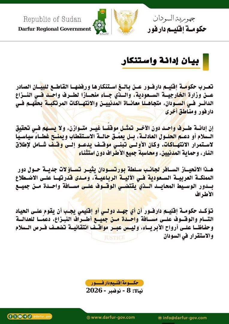 أصدرت حكومة إقليم دارفور في السودان، بيانا مساء الأحد، أعربت من خلاله عن بالغ استنكارها ورفضها القاطع للبيان الصادر عن وزارة الخارجية السعودية.