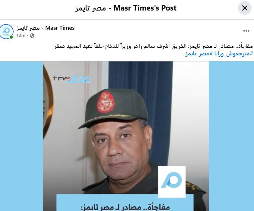 من جانبه، قال موقع "مصر تايمز" المصري إن الفريق أشرف سالم زاهر سيكون وزيرا للدفاع خلفا للفريق أول عبد المجيد صقر، حيث يشغل أشرف زاهر رئيس الأكاديمية العسكرية المصرية.