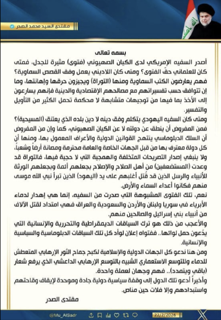 وقال الصدر في بيان إن السفير الأمريكي لدى "الكيان الصهيوني"، حسب وصفه، أصدر "تصريحات مثيرة للجدل"، متسائلا: "متى كان للعلماني حق الفتوى، ومتى كان اللاديني يعمل وفق القصص السماوية؟".