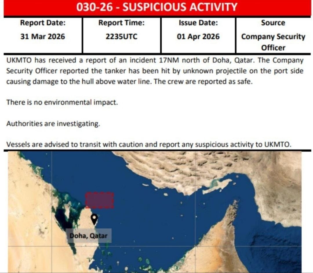 ووفق التحذير الصادر عن المركز، وقع الحادث على بعد 17 ميلا بحريا شمال منطقة رأس لفان، وأفاد مسؤول أمن تابع للشركة المالكة للناقلة أن السفينة تعرضت لإصابة بمقذوف على جانبها الأيسر، ما تسبب بأضرار في هيكل السفينة فوق خط الماء، دون تسجيل إصابات بين أفراد الطاقم.