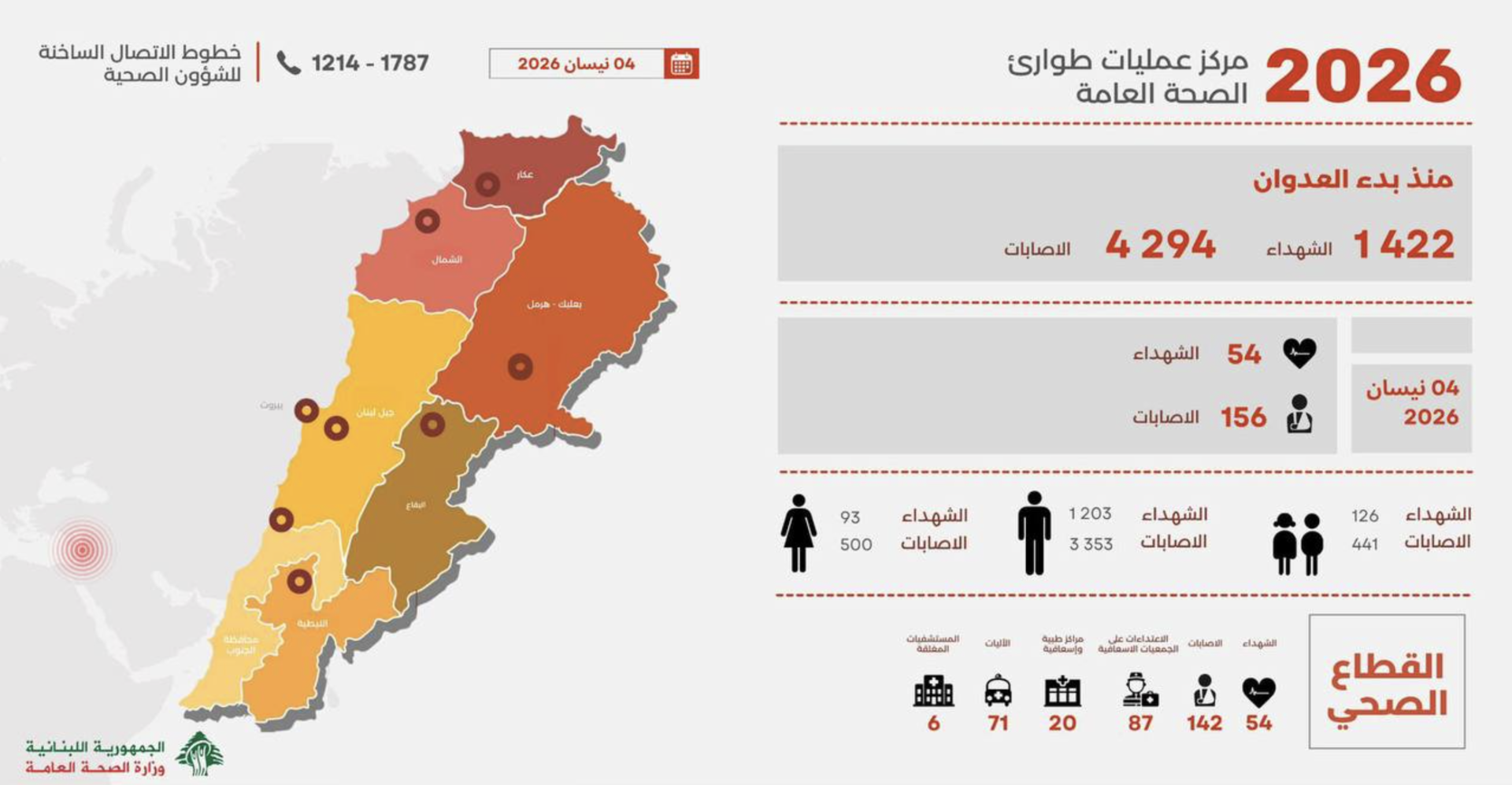 وفي سياق متصل، كشفت الوزارة أن إجمالي عدد الضحايا منذ بداية التصعيد بلغ 1422 قتيلا و4294 جريحا، ما يعكس حجم التداعيات الإنسانية والصحية المتفاقمة.