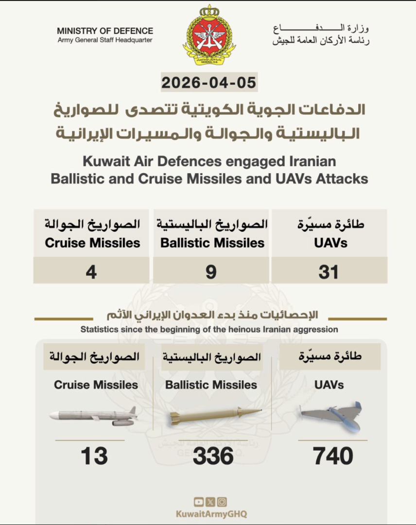 وأوضح المتحدث الرسمي باسم الوزارة العقيد الركن سعود عبد العزيز العطوان في بيان رقم (52)، أن القوات رصدت واعترضت 9 صواريخ باليستية و4 صواريخ جوالة، إلى جانب 31 طائرة مسيرة معادية داخل المجال الجوي الكويتي.