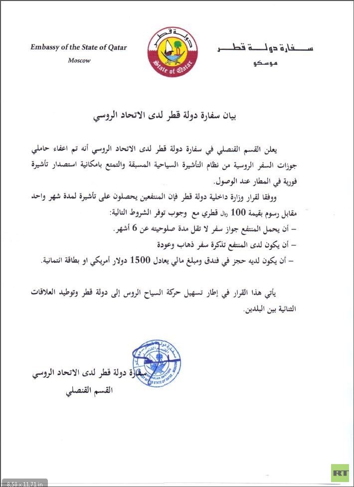 وأكد القسم القنصلي في السفارة القطرية لدى موسكو إعفاء حاملي جوازات السفر الروسية من نظام تأشيرة الدخول المسبقة والسماح لهم بالتمتع بإمكانية استصدار تأشيرة فورية في المطار عند الوصول.