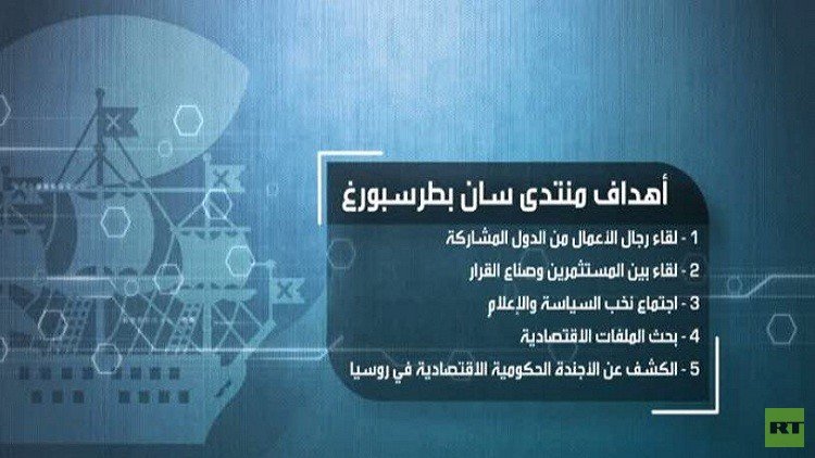 تحتضن مدينة سان بطرسبورغ الروسية فعاليات المنتدى الاقتصادي الدولي تحت شعار "حان وقت العمل"، من أجل بذل الجهود المشتركة لتحقيق الاستقرار والنمو.