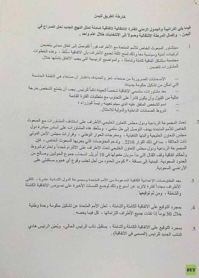 المبعوث الدولي الخاص باليمن إسماعيل ولد الشيخ أحمد كان قد أوضح في بيان صدر عنه أنه سلم وفد "أنصار الله" و"المؤتمر الشعبي العام" خريطة طريق مكتوبة تتطرق إلى التدابير الأمنية والسياسية المقترحة لإنهاء النزاع في اليمن، على أن يتقدم الوفد برده على المقترح في خلال الأيام القليلة المقبلة.